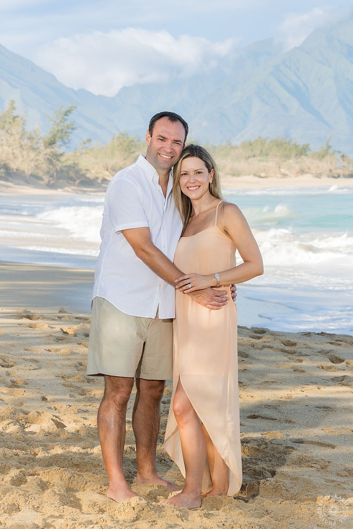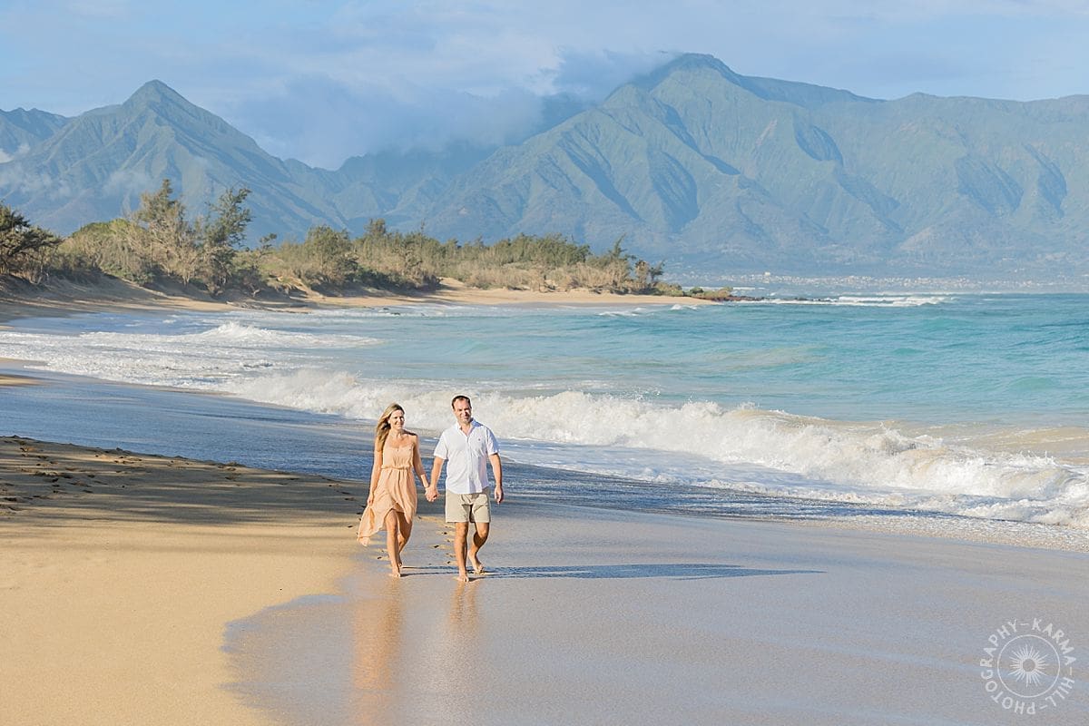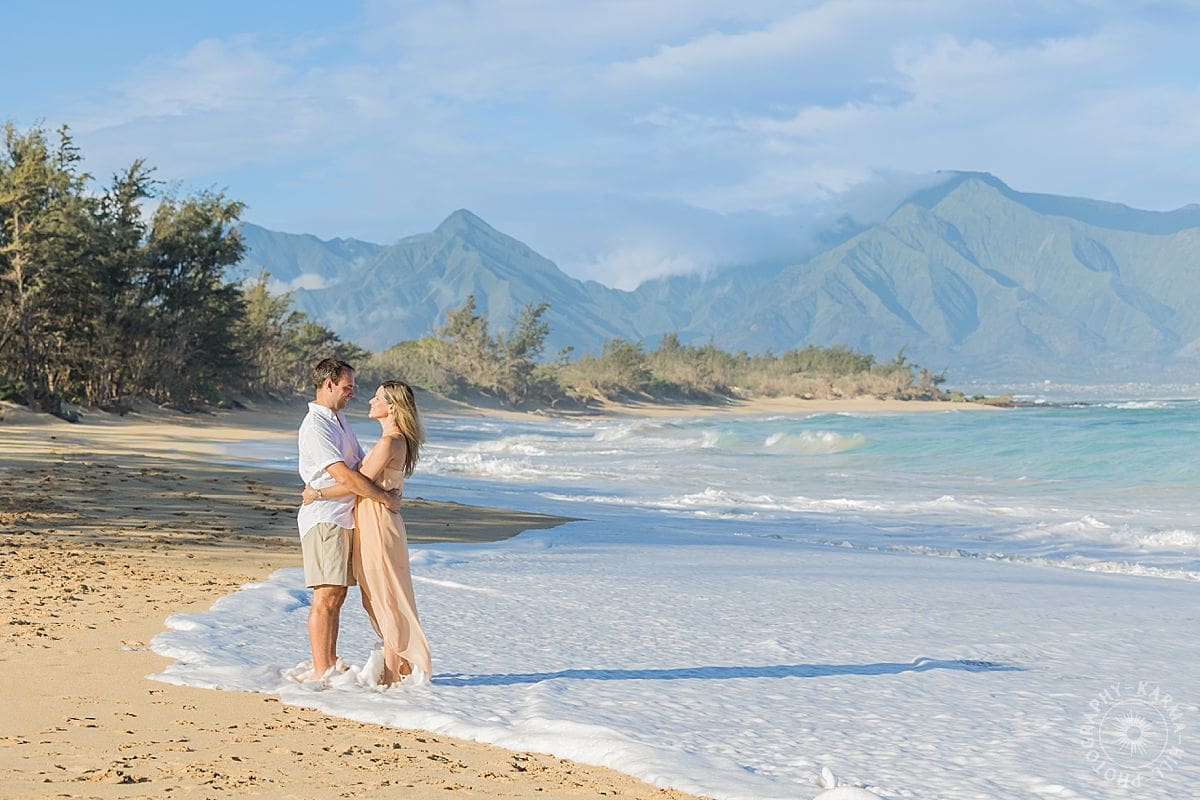 Back in 2017, it was just the two of them, newly married and glowing, walking hand in hand along Baldwin Beach while we captured their honeymoon portraits. It was one of those sessions that felt soft and golden and full of promise, the kind where you can practically see the future unfolding in front of you.