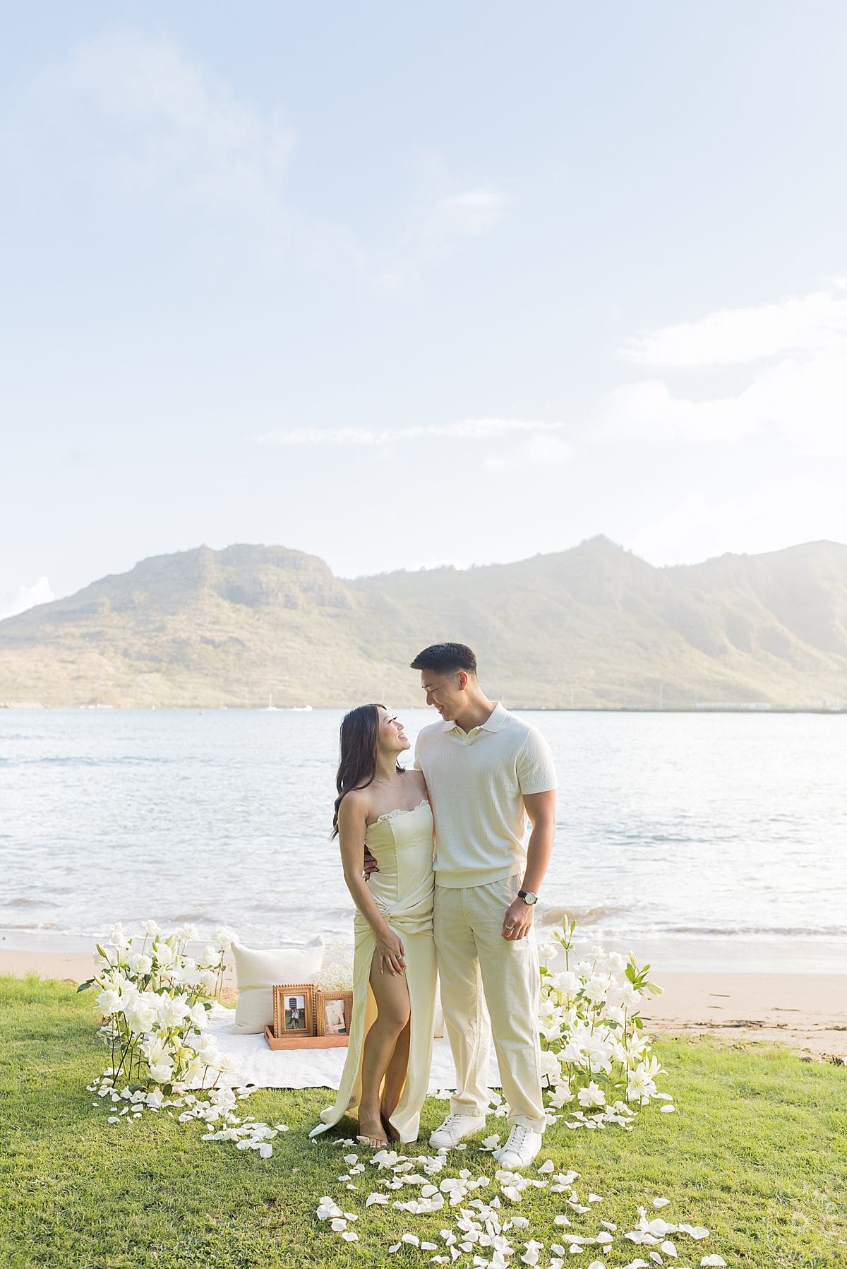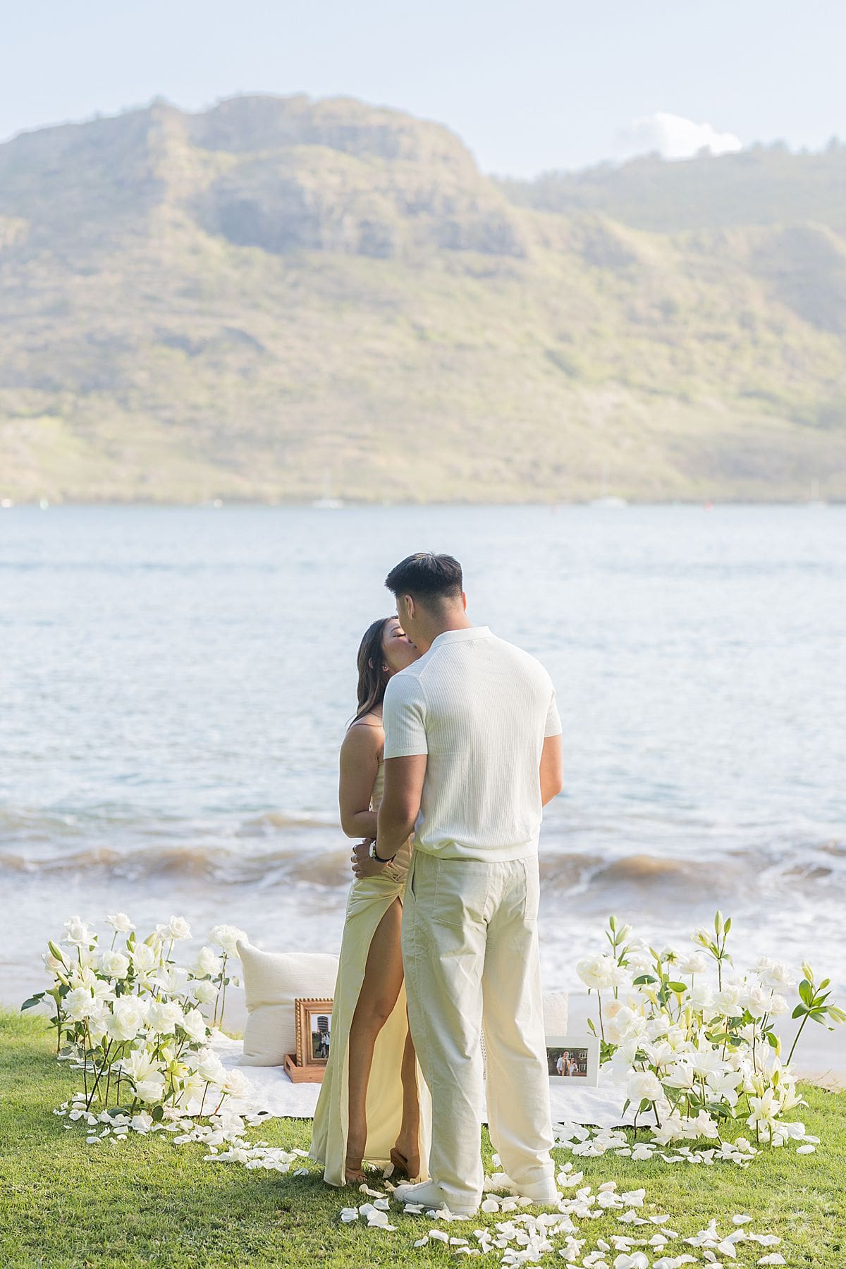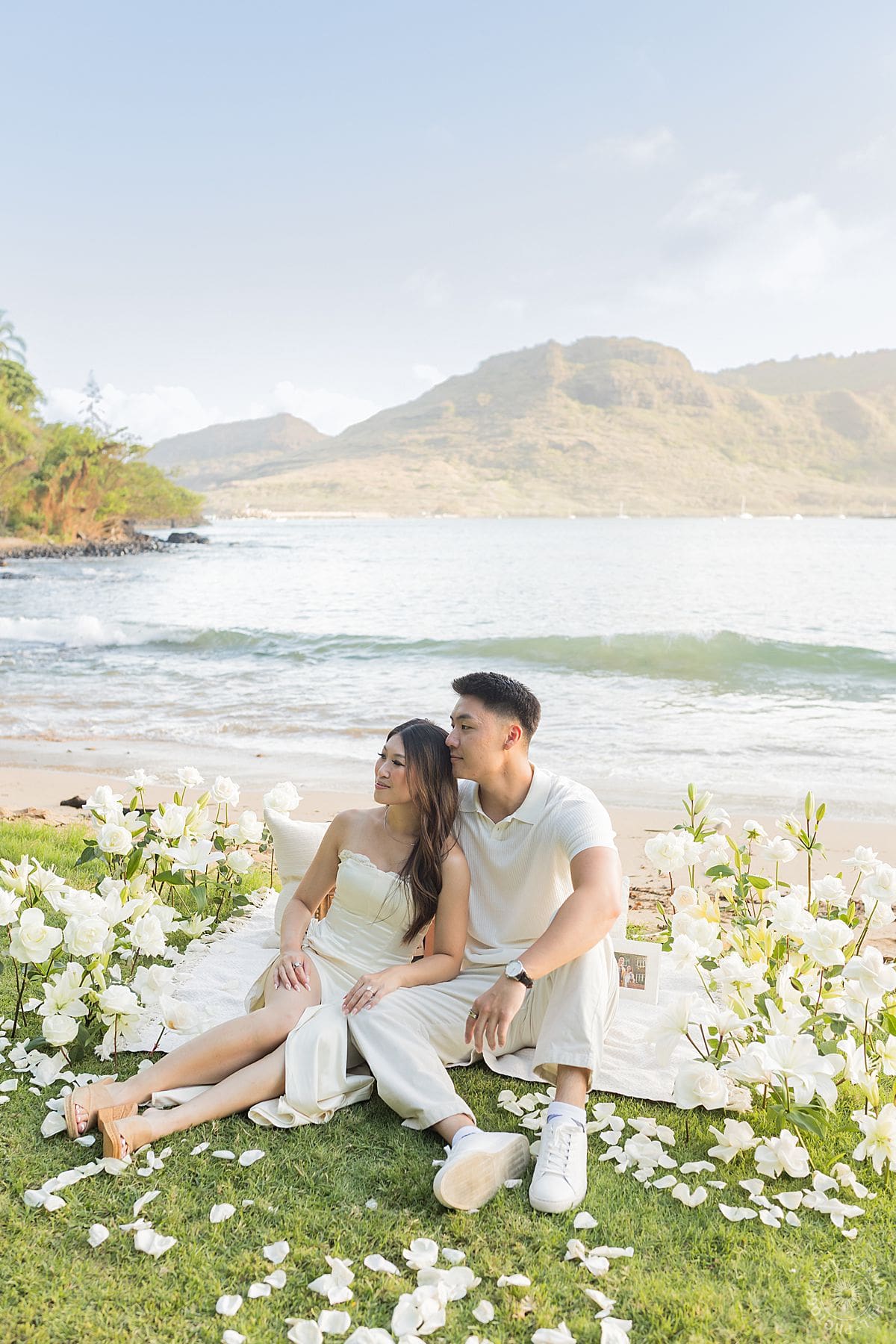 Sometimes love stories feel like they’re written in the stars, and Brendan and Alesia’s Kauai proposal portrait was one of those stories that unfolded with cinematic perfection. Picture this: the shoreline stretching wide, the mountains standing tall in the background, and a blanket lined with delicate white flowers and framed photographs. (How thoughtful?!) Each detail was carefully chosen to honor their love. It wasn’t just a setup; it was a stage for one of the sweetest chapters in their story!