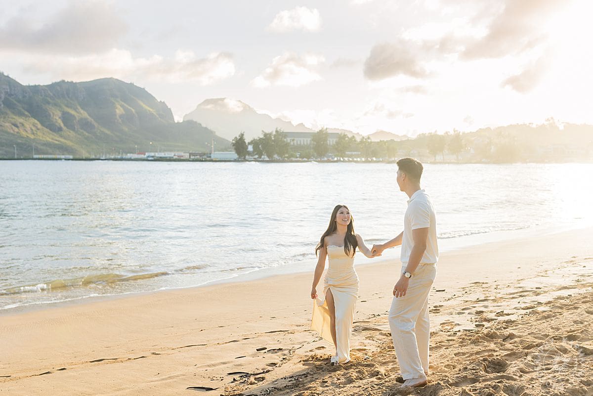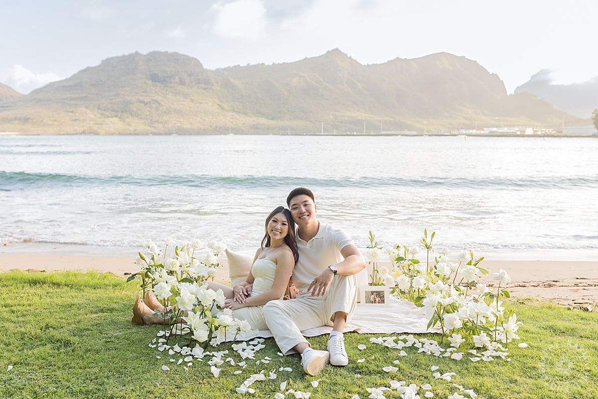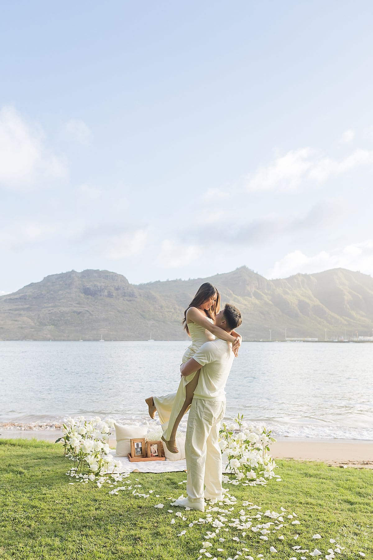 Sometimes love stories feel like they’re written in the stars, and Brendan and Alesia’s Kauai proposal portrait was one of those stories that unfolded with cinematic perfection. Picture this: the shoreline stretching wide, the mountains standing tall in the background, and a blanket lined with delicate white flowers and framed photographs. (How thoughtful?!) Each detail was carefully chosen to honor their love. It wasn’t just a setup; it was a stage for one of the sweetest chapters in their story!