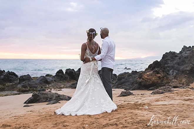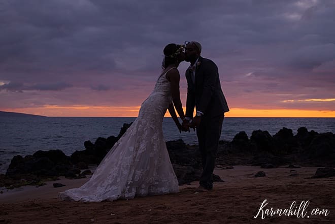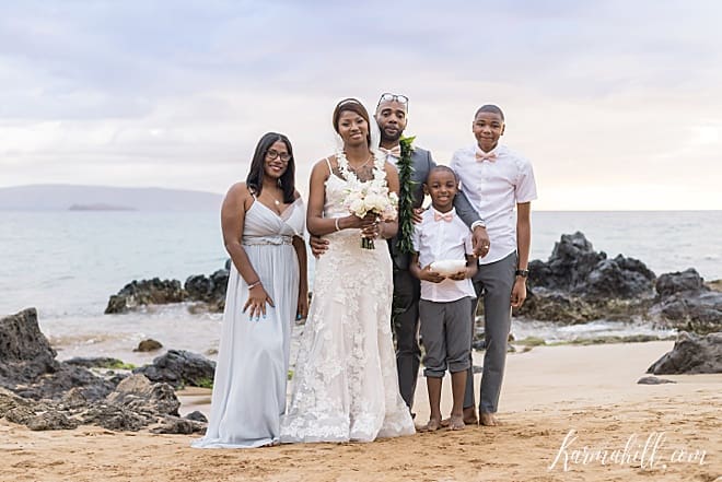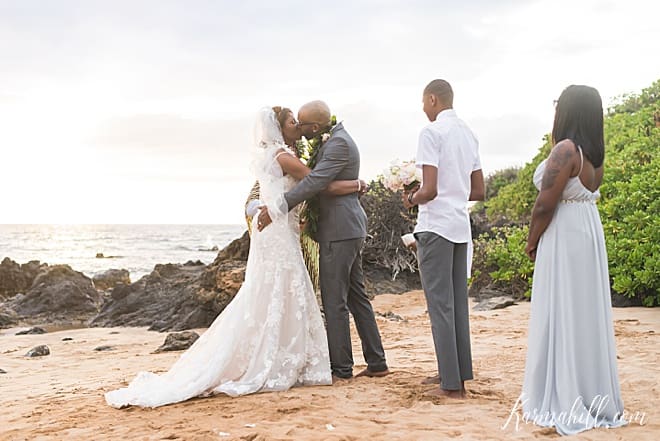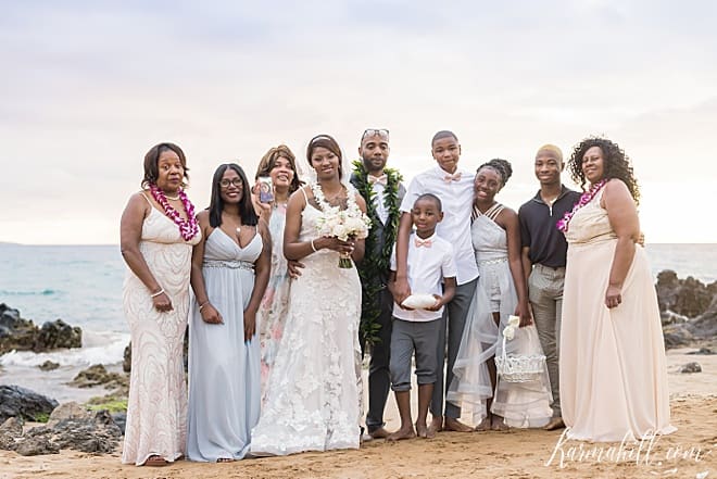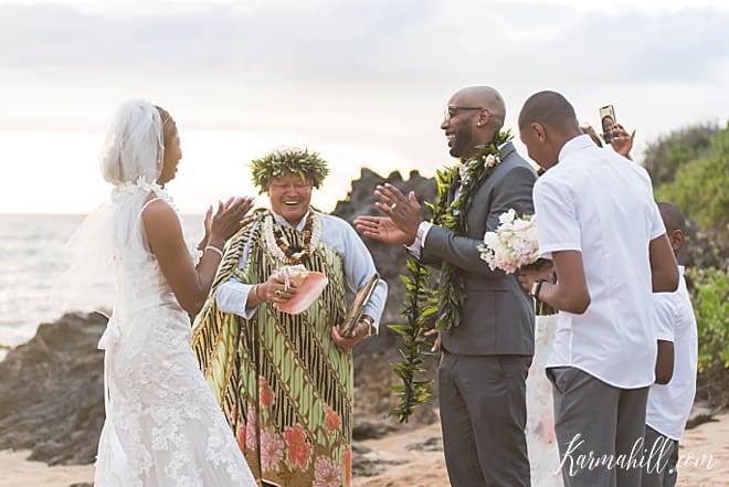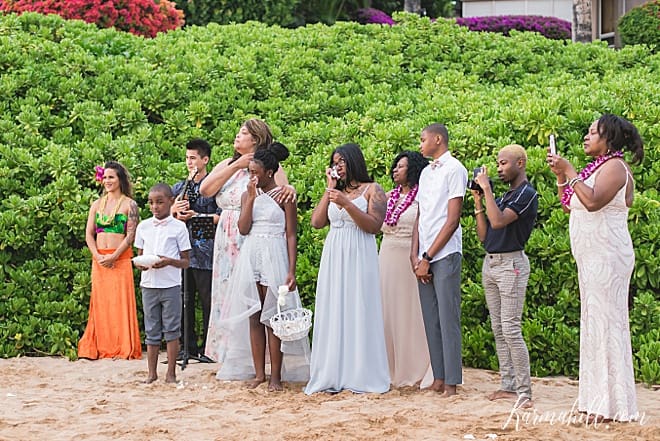 With their children and loved ones standing by, Tia and Roger were more than ready to say, “I do”. This moment where their daughters wiped away tears while watching the ceremony was so sweet, and we are so glad we captured it on camera! We are confident this is a day none of them will ever forget! Not only was it their first time to Maui, but it’s also the start of a new chapter of their lives together. Thank you, Tia and Roger, for sharing your wedding day with Karma Hill Photography. Congratulations and Warm Aloha!
