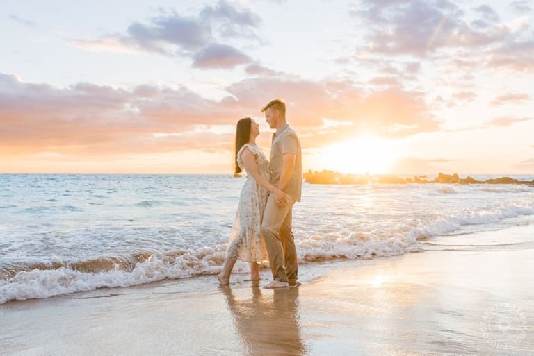 Let’s preface this amazing Maui proposal portrait for you…You know the kind of love story that starts in a college bar, the kind where you meet someone while hanging out with your friends and then somehow, years later, you’re standing barefoot on a Maui beach watching the love of your life get down on one