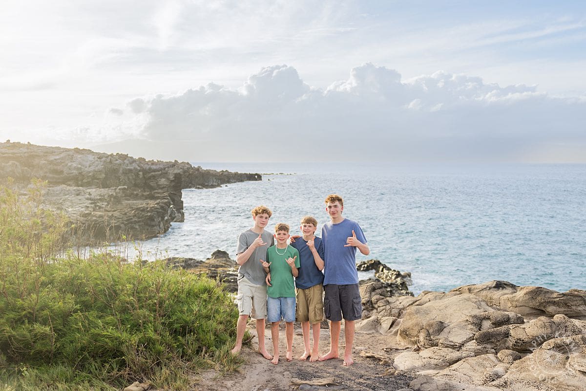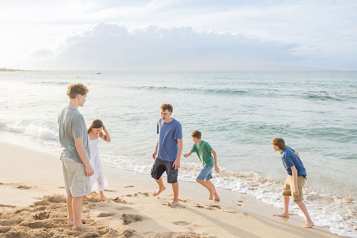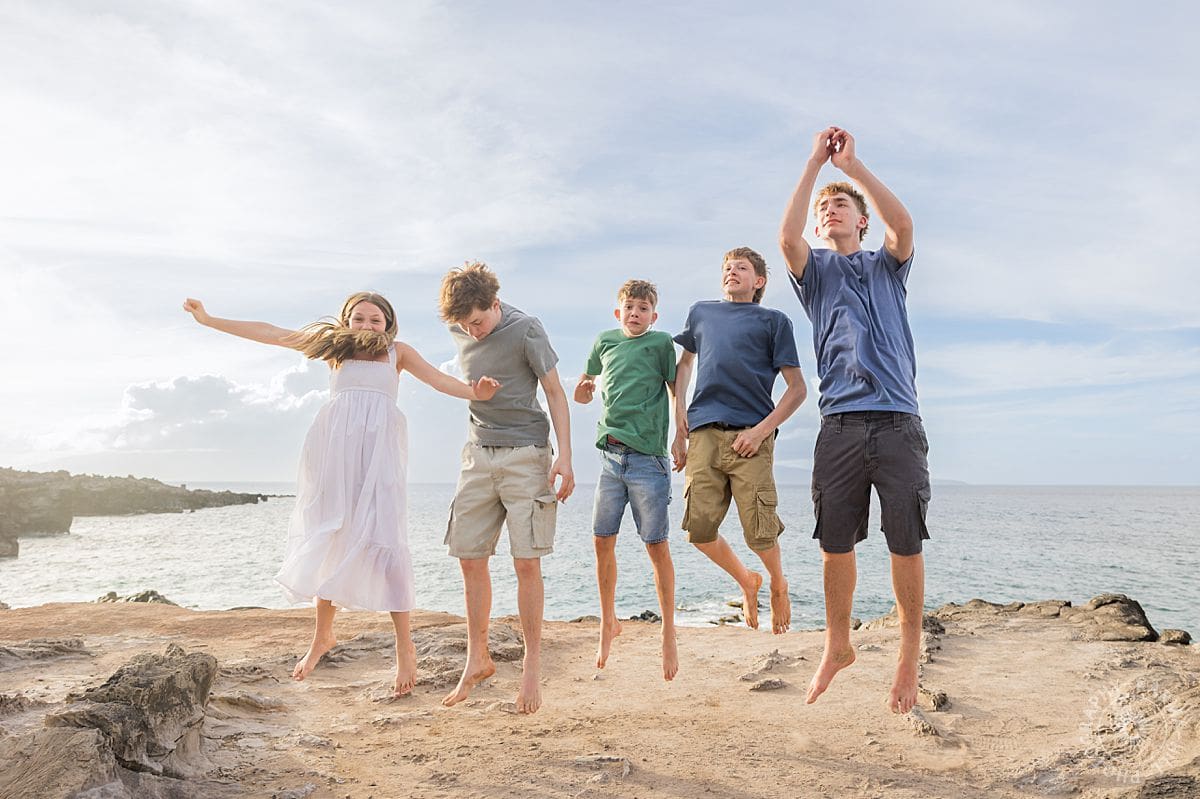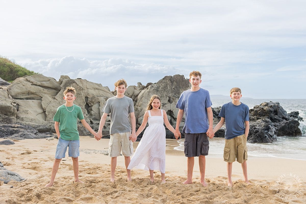 There is something effortlessly joyful about Maui family portraits at Ironwoods Beach, and the Wightman family brought that energy to life from the very first moment. With five kids, including one sweet sister surrounded by her four brothers, the session felt like a perfect mix of playful chaos and genuine connection.
