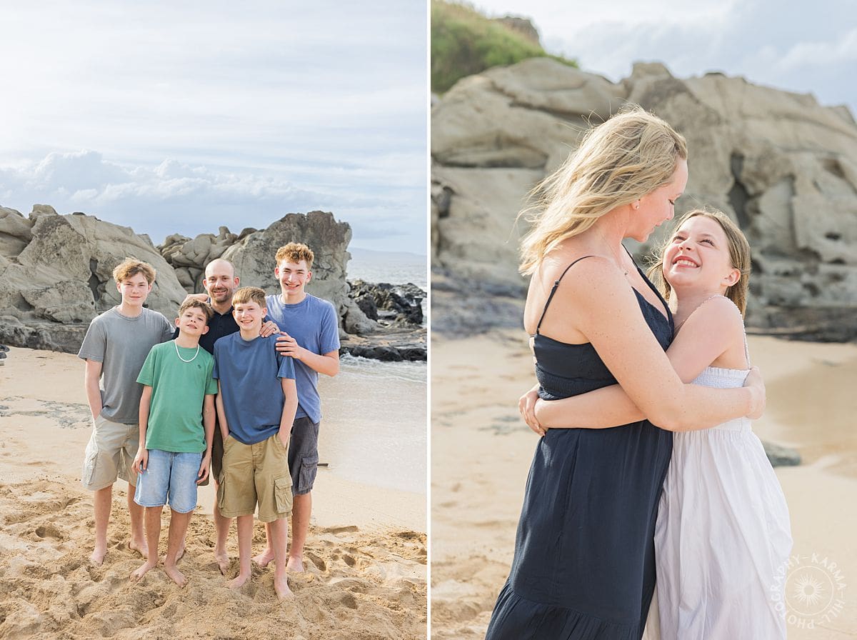 Barefoot in the sand and framed by soft ocean blues and rugged lava rock, they leaned into every laugh, every hug, and every in between moment that makes family time feel so real.
