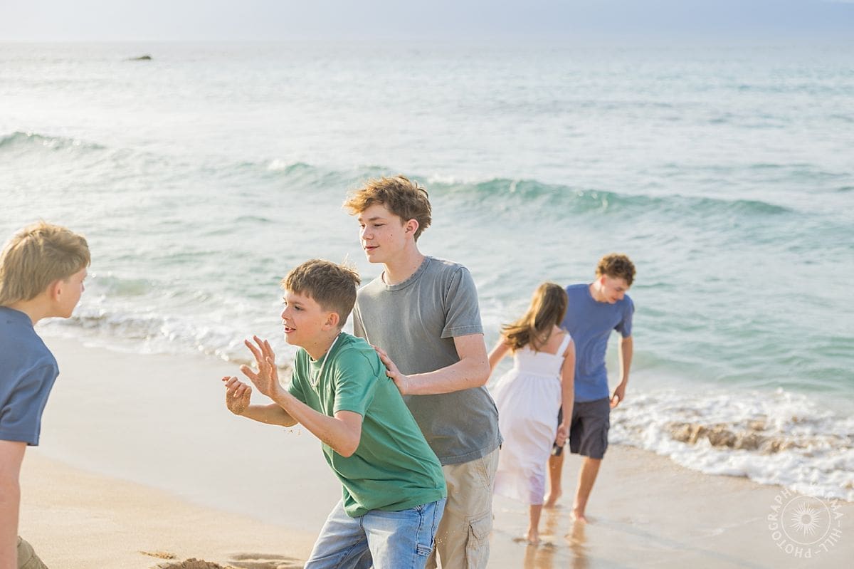 The boys kept things lively, racing along the shoreline and joking with each other, while their sister balanced it all with the kind of calm, happy presence that tied everyone together. Meanwhile, their parents shared quiet smiles and knowing glances, the kind that say this is exactly what life is meant to feel like. As the light softened, the entire family came together in a way that felt natural and unposed, full of movement, warmth, and love.
